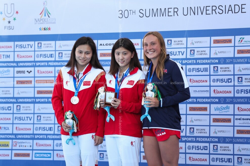 2019 7 5 1 7 4 Daria Tabea Lenz 30 1 SP ITALY NAPLES SUMMER UNIVERSIADE DIVIING WOMEN S 1M SPRINGBOARD MEDAL CEREMONY Gold medalist Song Shoulin C silver medalist Wu Chunting L of China and bronze medalist Daria Tabea Lenz stand on the podium at the medal ceremony of the Women's 1m Springboard diving at the 30th Summer Universiade in Naples Italy July 4 2019. Xinhua Zheng Huansong