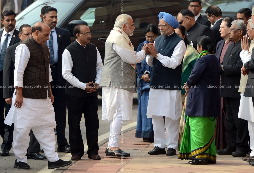 NEW DELHI, INDIA DECEMBER 13: Prime Minister Narendra Modi and Former Prime Minister Manmohan Singh exchange greetings during the tribute paying ceremony for the martyrs of 2001 Parliament attack on its16th anniversary, at Parliament House in New Delhi.(Photo by Parveen Negi/India Today Group) Narendra Modi;Manmohan Singh