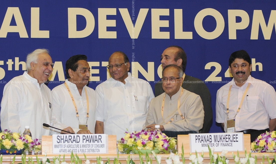 NEW DELHI INDIA JULY 24 L-R Union Ministers Kapil Sibal Kamal Nath Sharad Pawar Pranab Muhkerjee Ghulam Nabi Azad and Dayanidhi Maran during the 55th meeting of National Development Council at Vigyan Bhavan in New Delhi on July 24 2010. Photo by Naveen Jora India Today Group Kapil SibalKamal NathSharad PawarPranab MukherjeeGhulam Nabi AzadDayanishi Maran