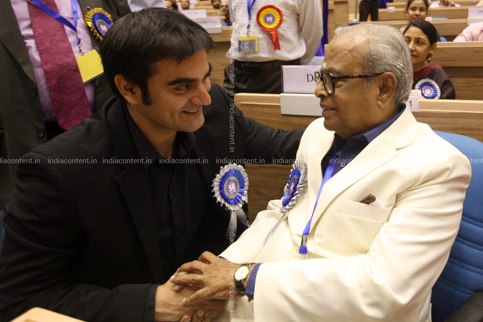 NEW DELHI INDIA - SEPTEMBER 09 Dadasaheb Phalke Award winner K Balachander with actor Arbaz Khan during the 58th National Film Awards Function in New Delhi on Friday. Photo by Shekhar YadavIndia Today Group K BalachanderArbaz Khan
