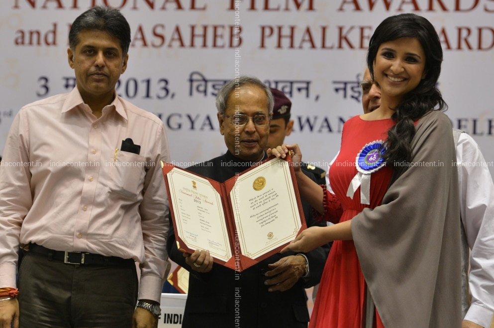 NEW DELHI INDIA - MAY 03 President Pranab Mukherjee presenting Special Mention award TO actress Parineeti Chopra AT the 60th NATIONAL Film Awards 2013 IN NEW Delhi ON Friday. Photo BY Pankaj Nangia India Today GROUP Pranab MukherjeeParineeti Chopra