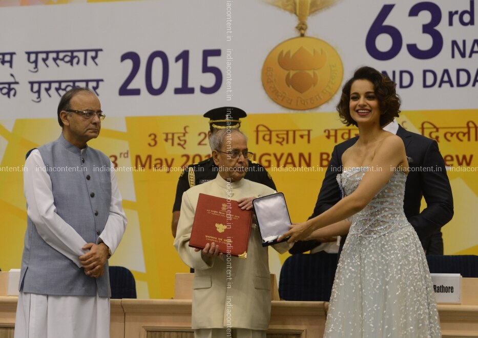 NEW DELHI INDIA MAY 03 President Pranab Mukherjee presents Best Actress award TO Kangana Ranaut AT the 63rd NATIONAL Film Awards 2015 IN NEW Delhi.Photo BY Pankaj Nangia India Today GROUP Pranab MukherjeeKangana Ranaut