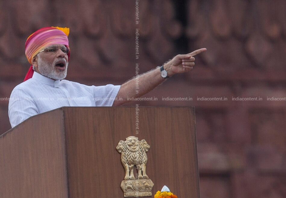 DELHI INDIA AUGUST 15 Prime Minister Narendra Modi IS addressing the nation FROM the ramparts of the historic Red Fort ON the occasion of the 70th Independence DAY IN NEW Delhi.Photo BY Pankaj Nangia India Today GROUP Narendra Modi