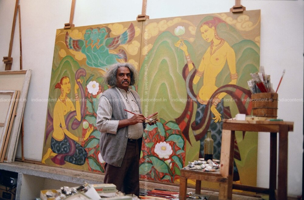 A.Ramachandran, Modern Indian Painter painting on a canvas in his studio ( Artist, Profile )
