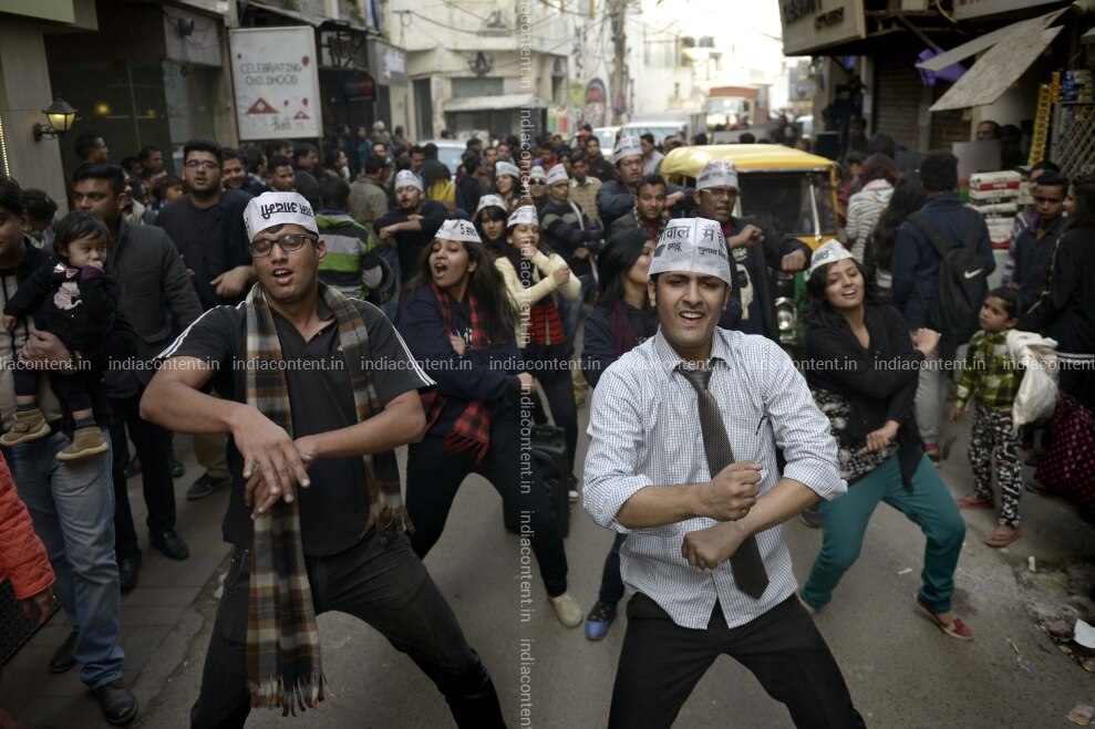 Aam Admi Party supporters and volunteers doing a flash mob at Hauz Khaz Village in New Delhi India on Sunday January 11 2015. Photo by M Zhazo