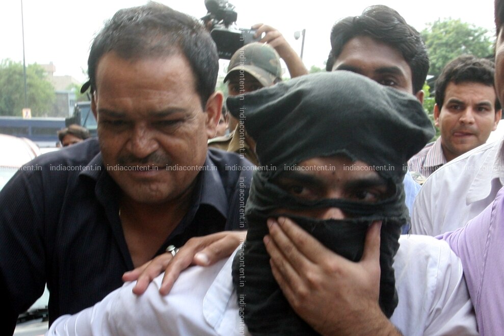 NEW DELHI INDIA - JULY 20 Syed Zabiuddin Ansari alias Abu Jundal center masked a suspect in the 2008 Mumbai attacks arrested two weeks ago being produced in Tis Hazari court in New Delhi on Friday. Photo by Qamar Sibtain India Today Group Abu Jundal