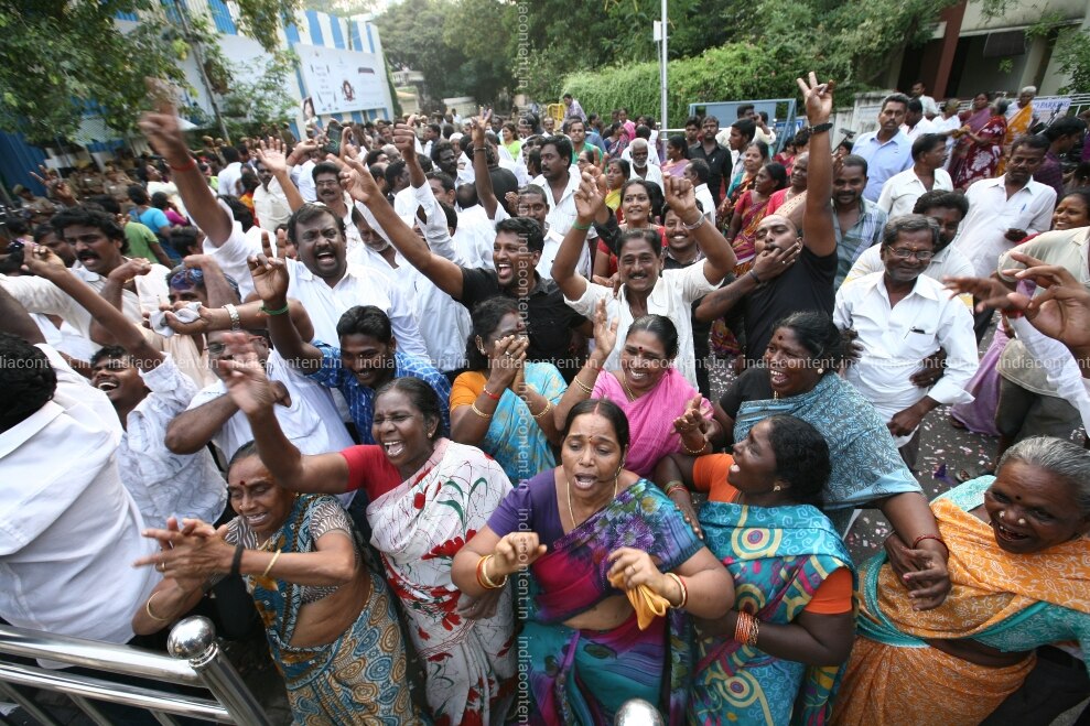 CHENNAIINDIA OCTOBER 7 AIADMK party workers celebrating IN front of the party supremo J Jayalalithaas house AT Poes Garden IN Chennai ON Tuesday ON hearing a rumor that the jailed leader got bail.Photo BY Jaison G India Today GROUP