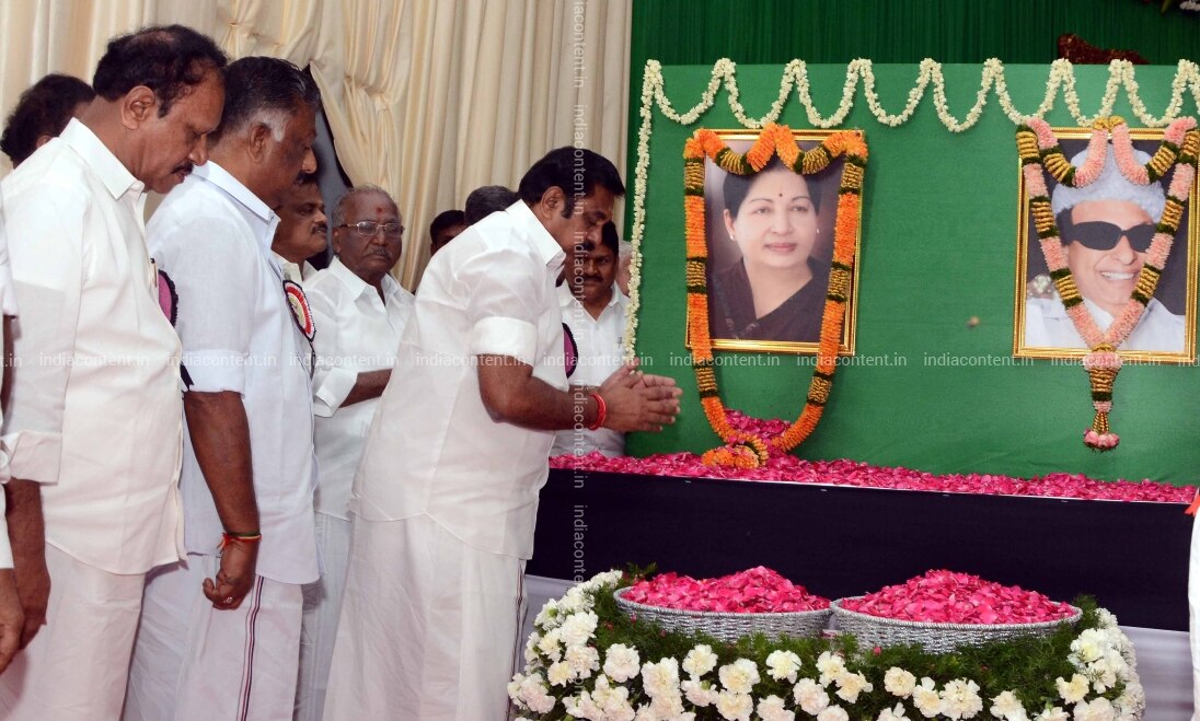 Tamil Nadu deputy cheif minister O Panneerselvam offering floral tribute to former TN CM J Jayalalithaa during the AIADMK party general council meeting in Chennai on Tuesday September 12 2017. Photo by Jaison G