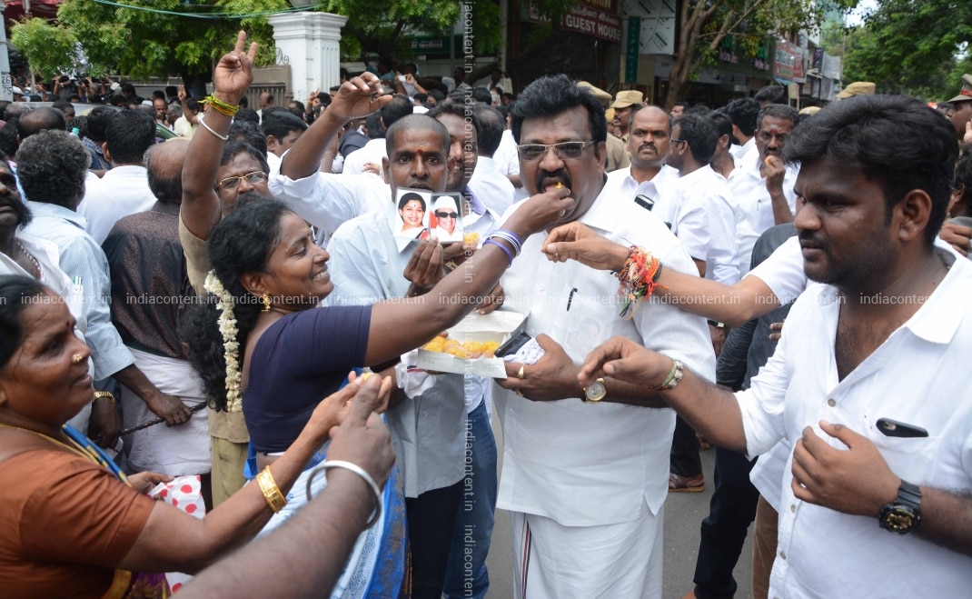 AIADMK workers celebrate at the party head quarters as the two fractions of AIADMK party headed by EPS and OPS meeting at the party office for the official merger in Chennai on Monday August 21 2017 Photo by Jaison G