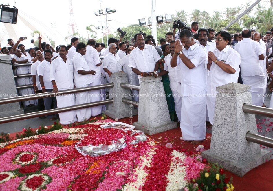 The new deputy chief minister O Paneerselvam paying respect at the burial place of J Jayalalithaa after the two fractions of AIADMK party headed by EPS and OPS officially merged in Chennai on Monday August 21 2017 Photo by Jaison G
