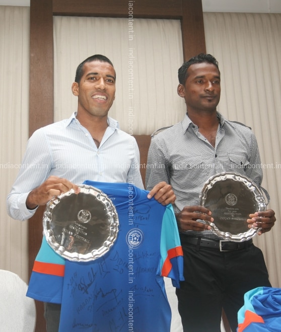 NEW DELHI INDIA - FEBRUARY 14 Indian footballer Mahesh Gawli and Climax Lawrence being felecitated by All India Football Federation during a function in New Delhi on Tuesday. Photo by Qamar Sibtain India Today Group Mahesh GawliClimax Lawrence
