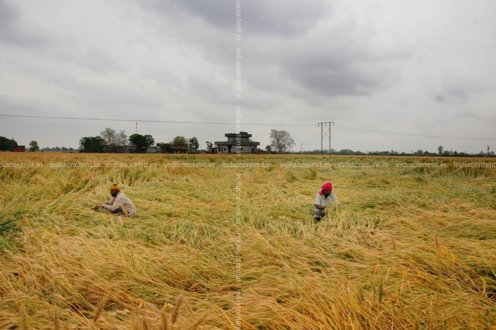 Buy Amritsar Farmers inspect their wheat crop at a field on the outskirts of Amritsar on April 17 2019 Standing wheat crop was damaged after rain dust storm and strong winds lashed Punjab on Tuesday Harvesting of wheat is on for the past 10 days in Pictures, Images, Photos By IANS - Others pictures