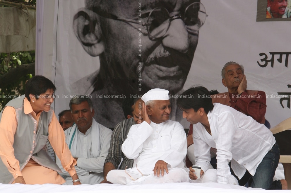 NEW DELHI INDIA - MARCH 25 India anti-corruption activist Anna Hazare and talks to his suppoter during his daylong hunger strike at Jantar Mantar in New Delhi India Sunday March 25 2012. Hazare is on a daylong hunger strike to protest the killings of a slew of rights activists across the country. Photo by Kaushik Roy India Today Group Anna HazareKiran Bedi