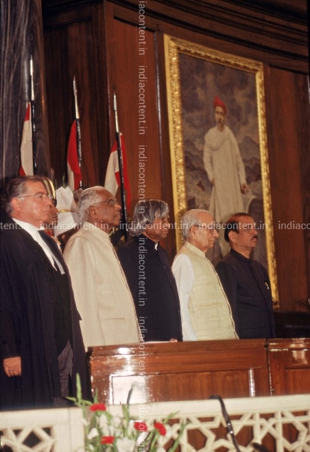 APJ Abdul Kalam President of India with Krishna Kant KR Narayanan Manohar Joshi and others standing in Parliament House at New Delhi President News Profile