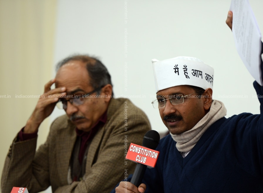 NEW DELHI INDIA - FEBRUARY 16 AAP convener Arvind Kejriwal WITH Prashant Bhushan AT a press conference IN NEW Delhi ON Saturday. Photo BY Parveen Negi India Today GROUP Arvind KejriwalPrashant Bhushan