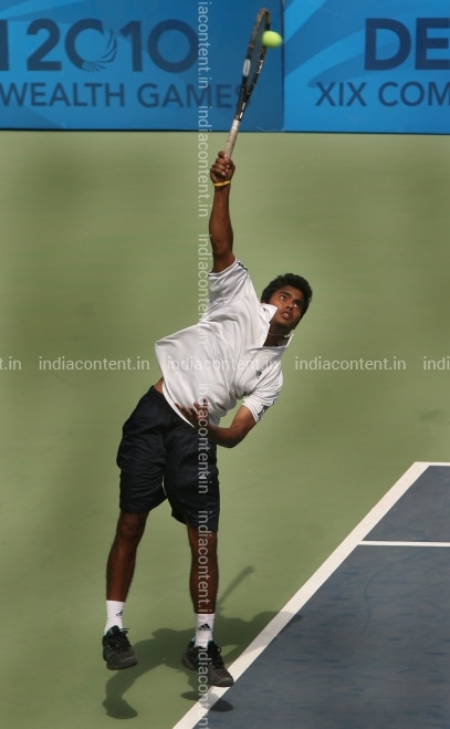 NEW DELHI INDIA MAY 26 Fourth seed Sai Kartik Nakireddi serves against Kazakh Dmitriy Borodkin at the Asian Juniors Tennis Championships New Delhi on May 26 2010. Sai won the match. Photo by Rahul Irani India Today Group Sai Kartik Nakireddi
