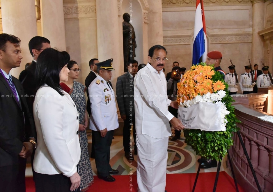 Asuncion Vice President M. Venkaiah Naidu pays tribute to fallen heroes of Paraguay at the National Pantheon of Heroes in Asuncion Paraguay on March 6 2019. Photo IANS PIB