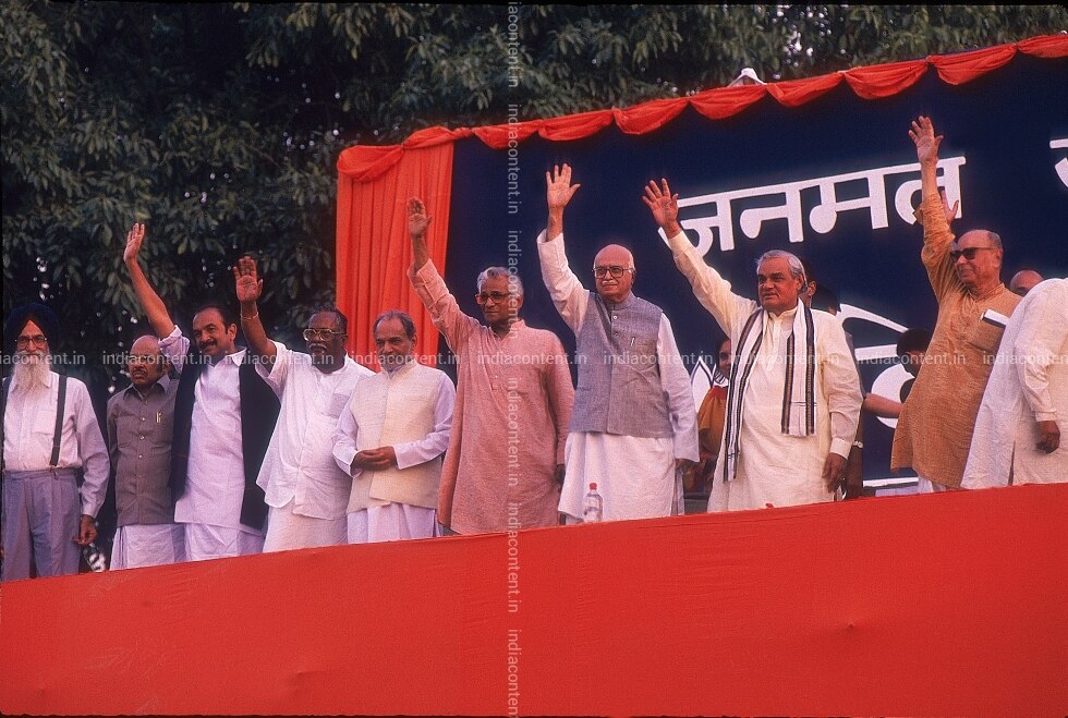 NEW DELHI INDIA APRIL 26 Former Prime Minister of India Atal Bihari Vajpayee Member of the Lok Sabha L. K. Advani Indian politician George Fernandes and Indian politician Kushabhau Thakre during a public meet in New Delhi. Photo by Saibal Das India Today Group Atal Bihari Vajpayee L. K. Advani George Fernandes Kushabhau Thakre