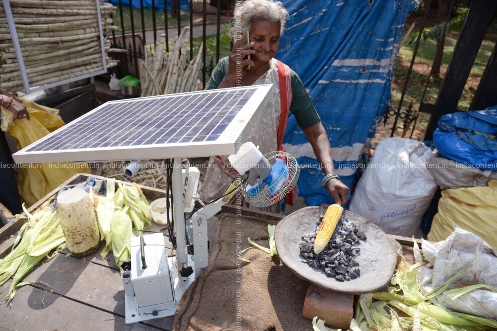 Bengaluru 75 year old Selvamma who has been selling corn outside Vidhana Soudha building for over 20 years and used to constantly fan the coal to roast corn now using a solar powered fan to grill Corn near Vidhana Soudha in Bengaluru on Feb 2 2019. Photo IANS