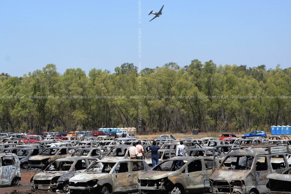 Bengaluru A view of burnt out cars where a fire broke out at the parking lot in front of Yelahanka Air Force Station gutting 300 cars in Bengaluru on Feb 24 2019. Photo IANS
