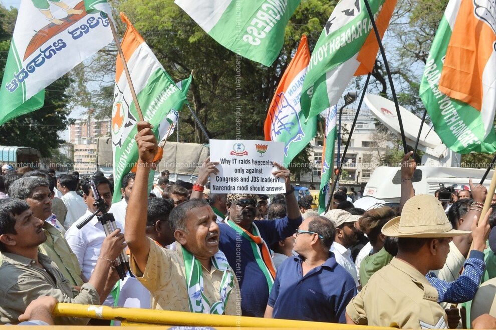 Bengaluru Congress and JD S workers stage a demonstration against Income Tax Department's raids at various places in Karnataka including state Minor Irrigation Minister and JD S leader C.S. Puttaraju's residence outside the IT Department's office in Bengaluru on March 28 2019. Photo IANS