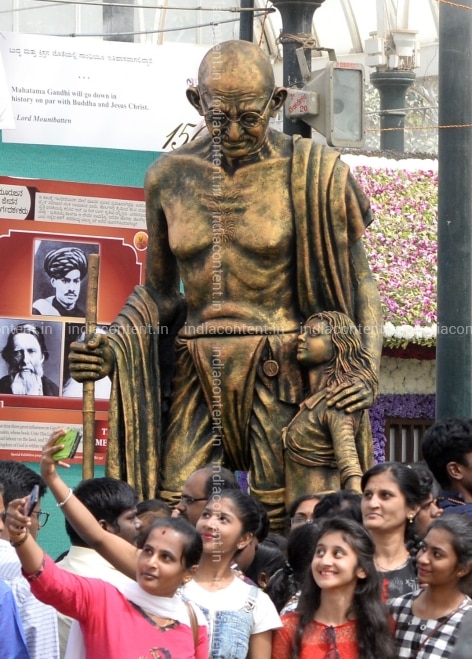 Bengaluru Visitors take selfie with Mahtma Gandhi's statue at Lalbagh Republic Day flower show in Bengaluru on Jan 20 2019. Photo IANS