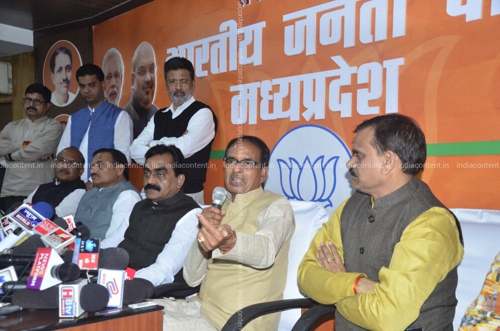 Bhopal BJP leader Shivraj Singh Chouhan addresses a press conference in Bhopal on Dec 12 2018. Also seen Madhya Pradesh BJP President Rakesh Singh. Photo IANS
