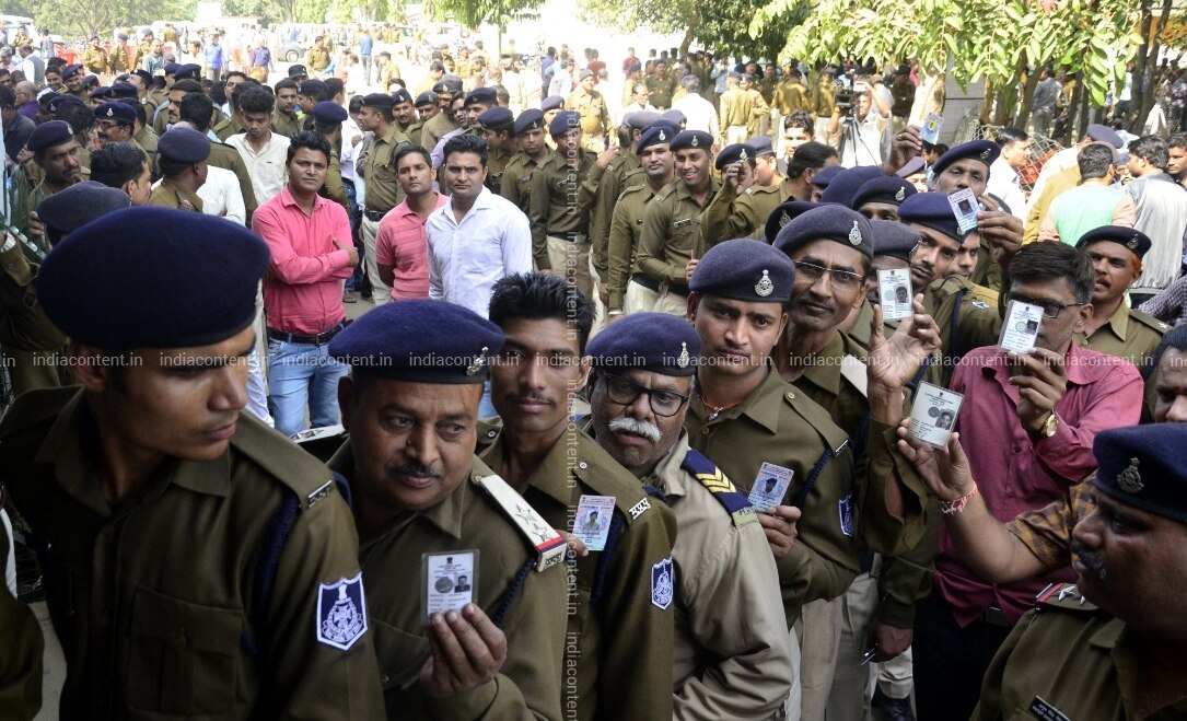 Bhopal Security personnel queue up outside a polling booth to cast their votes for the upcoming Madhya Pradesh Assembly elections through postal ballot in Bhopal on Nov 18 2018. Photo IANS