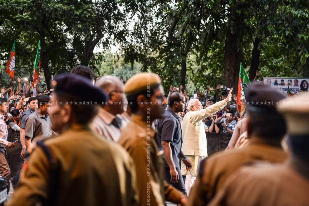 NEW DELHI, INDIA - MARCH 12: Prime Minister Narendra Modi waves TO his supporters WHILE heading towards BJP headquarters TO celebrate party landslide victory IN assembly elections, ON March 12, 2017 IN NEW Delhi, India. The BJP wins a stunning victory IN Uttar Pradesh AND Uttarakhand, trampling a fragmented opposition that had hoped the demonetisation exercise would have chipped away AT Prime Minister Narendra Modi's popularity. Photo by Vikram Sharma