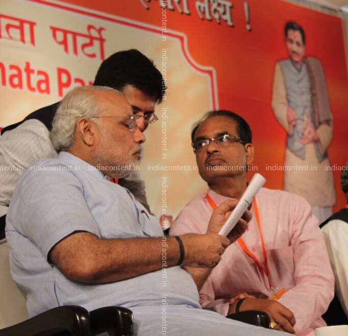 SURAJKUND INDIA - SEPTEMBER 27 Gujarat Chief Minister Narendra Modi with Madhya Pradesh Chief Minister Shivraj Singh Chauhan and Ravi Shankar Prasad during the 2nd day of the BJP National Executive meeting at Surajkund Faridabad on Thursday 27th September 2012. Photo by Parveen Negi India Today Group Narendra ModiShivraj Singh ChauhanRavi Shankar Prasad