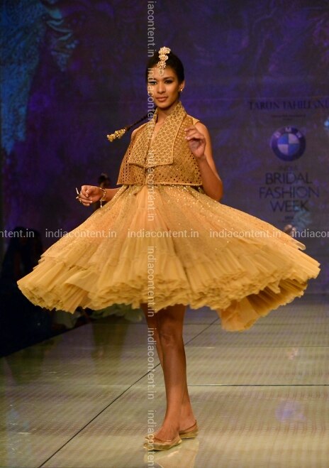 NEW DELHIINDIA JULY 07 A model walks the ramp FOR designer Tarun Tahiliani AT BMW India Bridal Fashion WEEK 2014 IN NEW Delhi.Photo BY K.Asif India Today GROUP