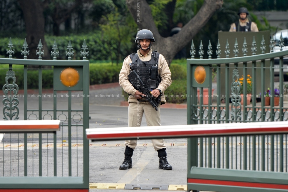 NEW DELHI INDIA FEBRUARY 26 Security Personnel clicked outside Prime Minister Narendra Modi's residence where a meeting of the Cabinet Committee on Security was being held at Lok Kalyan Marg in New Delhi. Photo by K Asif India Today Group