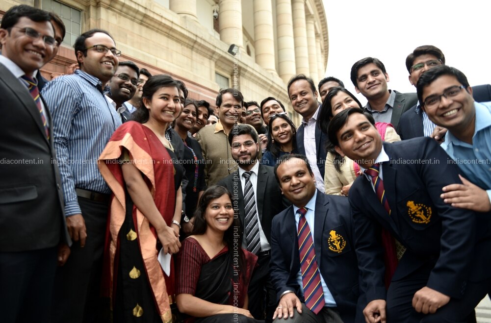Suresh Prabhakar Prabhu Indian politician and the current Railway Minister of India under the Narendra Modi government Posing for photograph with students at Parliament House New Delhi on March 16 2017. Photo by Chandradeep Kumar