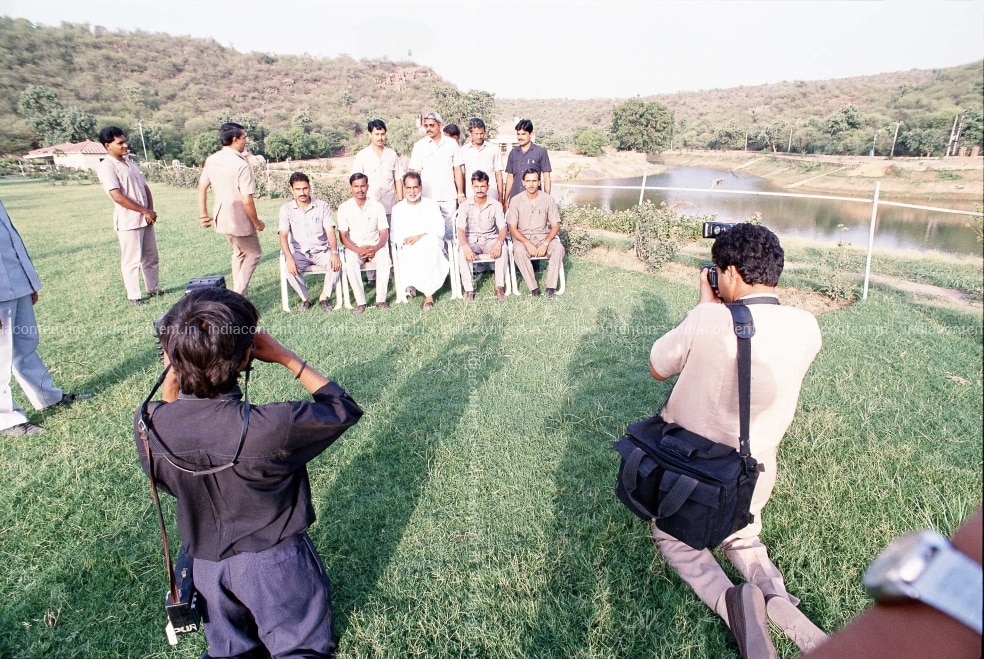 Chandra Shekhar, Prime Minister sitting with his securitymen at bhondsi (Samajwadi Janata Party, Group Picture )