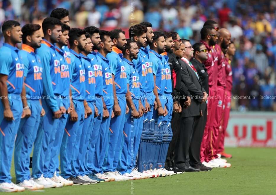 Chennai Players of India and West Indies stand for their National Anthem ahead of the the 1st ODI match between India and West Indies at MA Chidambaram Stadium in Chennai on Dec 15 2019. Photo Surjeet Yadav IANS