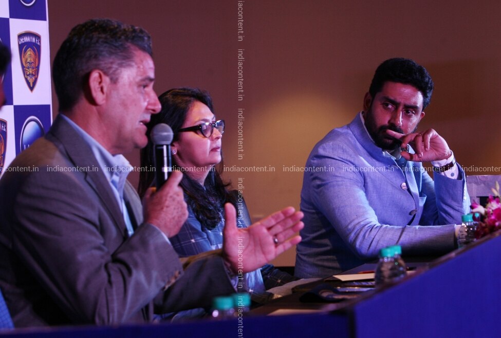ISL team Chennaiyin FC's new coach John Gregory left speaks as the team co owers Abishek Bachchan raght and Vinita Dani during a press meet to introduce him in Chennai on Friday July 21 2017. Photo by Jaison G