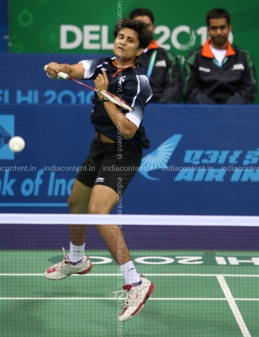 NEW DELHI INDIA OCTOBER 4 Indias Chetan Anand in action during his badminton qualifier round at Commonwealth Games in New Delhi on Monday October 4 2010. Photo by Qamar Sibtain India Today Group Chetan Anand
