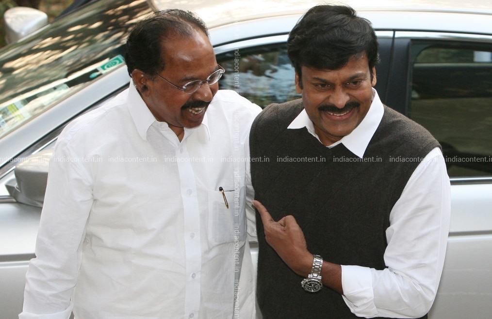 NEW DELHI INDIA - FEBRUARY 06 Actor-turned Politician and Praja Rajyam Party PRP Chief Chiranjeevi R addresses the media as Senior Congress leader Veerappa Moily L looks on outside the Congress Party President Sonia Gandhi residence after a meeting in New Delhi on February 6 2011. Photo by K Asif India Today Group ChiranjeeviVeerappa Moily