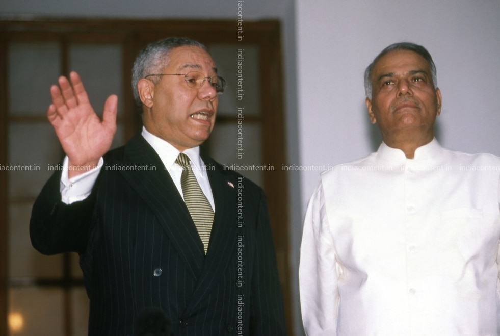 Colin Powell US Secretary of State with Foreign Minister Yashwant Sinha in New Delhi Foreign Affairs Together