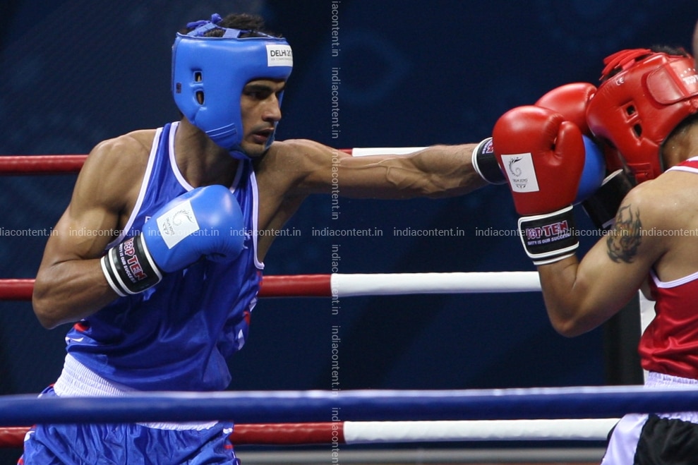 NEW DELHI INDIA OCTOBER 5 Indias Jai Bhagwanin blue in action against Caleb of Nauru in New Delhi on October 5 2010. Photo by Parveen Negi India Today Group Jai BhagwanCaleb