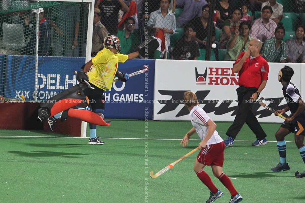 NEW DELHI INDIA OCTOBER 12 Indian hockey playersblue in action against England in their mens semi-final field hockey match at The Major Dhyan Chand National Stadium during the XIX Commonwealth Games in New Delhi on October 12 2010. India made it to the Commonwealth Games mens hockey final on Tuesday beating England 5-4 on penalties after the scores were tied 3-3 at the end of extra-time. Photo by Naveen Jora India Today Group