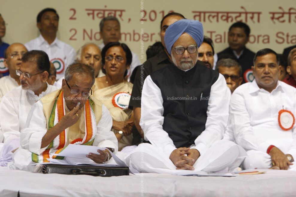 NEW DELHI INDIA NOVEMBER 02 Prime Minister Manmohan Singh with Pranab Mukherjee attends the All India Congress Committee AICC meet in New Delhi on November 2 2010.Photo by Sipra Das India Today Group Manmohan SinghPranab Mukherjee