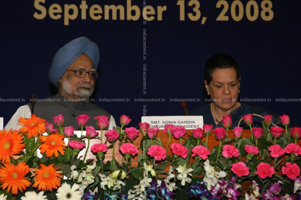 Sonia Gandhi President of All India Congress Committee AICC and United Progressive Alliance UPA Chairperson along with Manmohan Singh Prime Minister of India and other Leaders at Congress Working Committee meeting in New Delhi India CWC Meeting