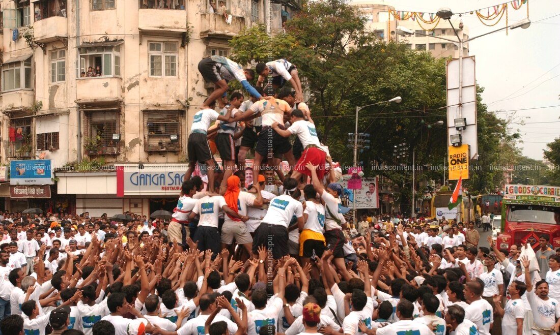 Onlookers watch as Hindu devotees form a human pyramid during the 'Dahi handi' curd pot festival to celebrate Janmashtami the birthday of Hindu God Lord Krishna in Mumbai 04 September 2007. During the 'dahi handi' ceremony a large earthenware pot filled with milk curds butter honey and fruits is suspended from a height between 20 to 40 feet. Sporting young men and boys come forward to claim this prize by constructing a human pyramid by standing on each other's shoulders till the pyramid is tall enough to enable the topmost person to reach the pot and claim the contents after breaking it. Normally currency notes are tied to the rope by which the pot is suspended and this prize money is distributed among those who participate in the pyramid building in Mumbai Maharashtra India Crowd