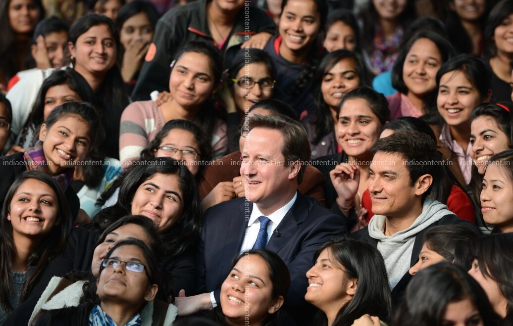 NEW DELHI INDIA - FEBRUARY 19 British Prime Minister David Cameron AND Actor Aamir Khan WITH Janki Devi College students IN NEW Delhi ON Tuesday. Photo BY Shekhar Yadav India Today GROUP David CameronAamir Khan