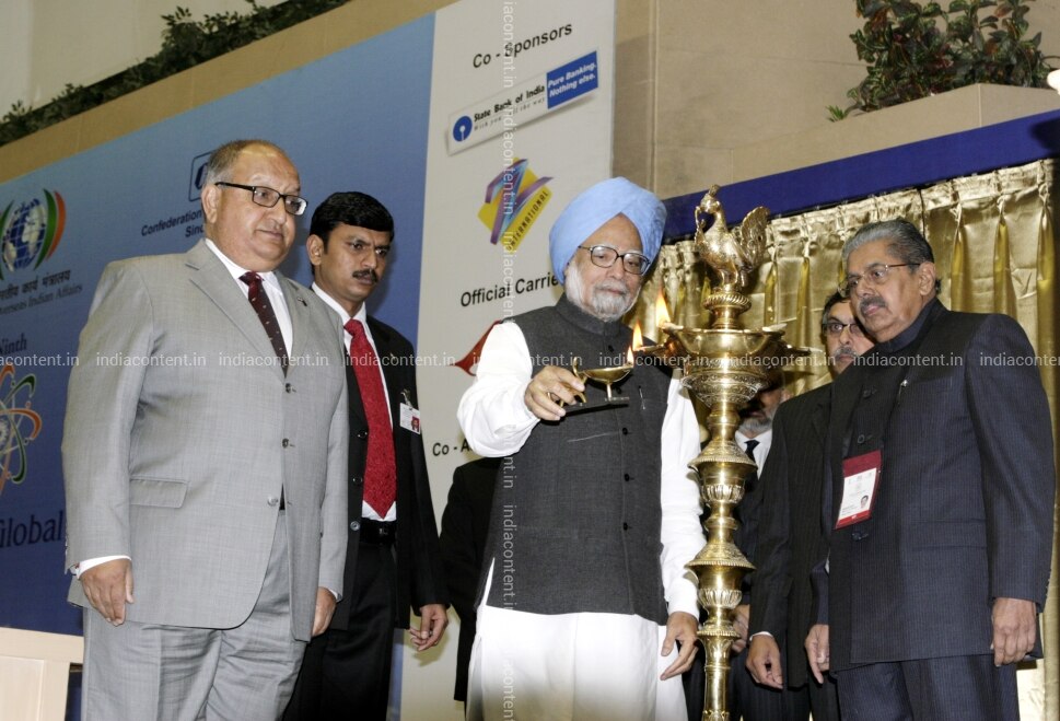 NEW DELHI INDIA JANUARY 08 PM Manmohan Singh inaugurates the 9th Pravasi Bharatiya Divas 2011 at Vigyan Bhavan in New Delhi on Saturday January 8 2011. Overseas Indian affairs minister Vayalar Ravi right and Sir Anand Satyanand left are also seen.Photo by Sipra Das India Today Group Manmohan SinghVayalar RaviSir Anand Satyanand