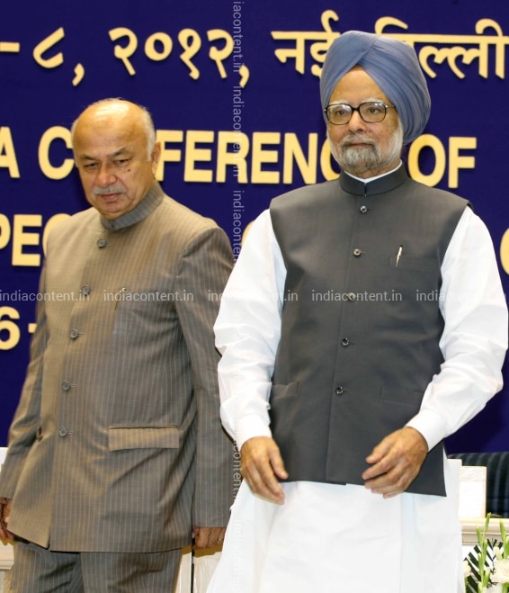 NEW DELHI INDIA - SEPTEMBER 08 Prime Minister Manmohan Singh with Home Minister Sushil Kumar Shinde at the All India Conference of DGPsIGPs at Vigyan Bhavan in New Delhi on Saturday. Photo by Naveen Jora India Today Group Manmohan SinghSushil Kumar Shinde