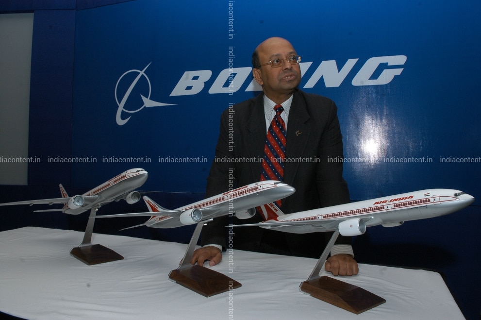 Dinesh A Keskar senior vice president Sales of Boeing in India picks up a model of the Dreamliner during a press conference in New Delhi India