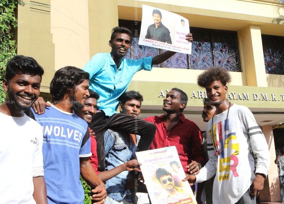 Members of DMK youth wing celebrate the elevation of party president MK Stalin's son Udayanidhi Stalin as the secretary of DMK youth wing in front of the party head quarters in Chennai on Thursday July 04 2019. Photo by Jaison G