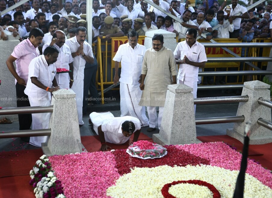 The new Tamil Nadu chief minister Edapadi K Palanisamy falling down at the Jayalalithaa samadhi at Marina beach in Chenai after his swearing in on Thursday February 16 2017. Photo by Jaison G